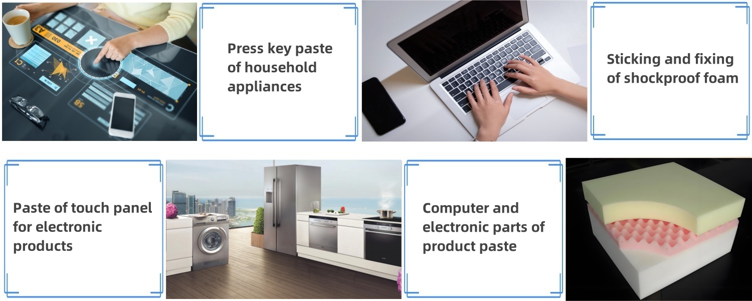 Metal sheets and nameplates bonding ; Suitable for small components of electronic products and phone ; Electrical appliance components and shockproof foam.